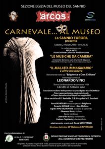 Sabato 2 marzo 2019 alle ore 20.30, presso il Museo Arcos, in via Stefano Borgia, nella cornice della Sezione Egizia, si terrà, nell’ambito del progetto “Carnevale al Museo”, l’evento musicale: “Il Malato Immaginario e altre maschere”, liberamente tratto da “Erighetta e Don Chilone” intermezzi comici di Leonardo Vinci.