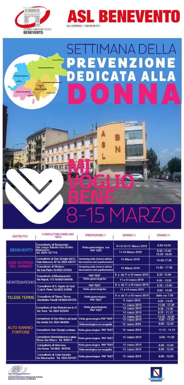 Anche quest’anno la Asl di Benevento aderisce alla “Settimana della prevenzione” promossa dalla Regione Campania per sensibilizzare le donne ad avere cura della propria salute. Da domani 8 marzo e fino al 15, presso i consultori dei distretti dell’azienda sanitaria, il personale medico provvederà ad effettuare visite ginecologiche, pap-test, ecografie pelviche e al seno in maniera completamente gratuita. Si accede direttamente ai consultori senza prescrizione medica, né prenotazione.