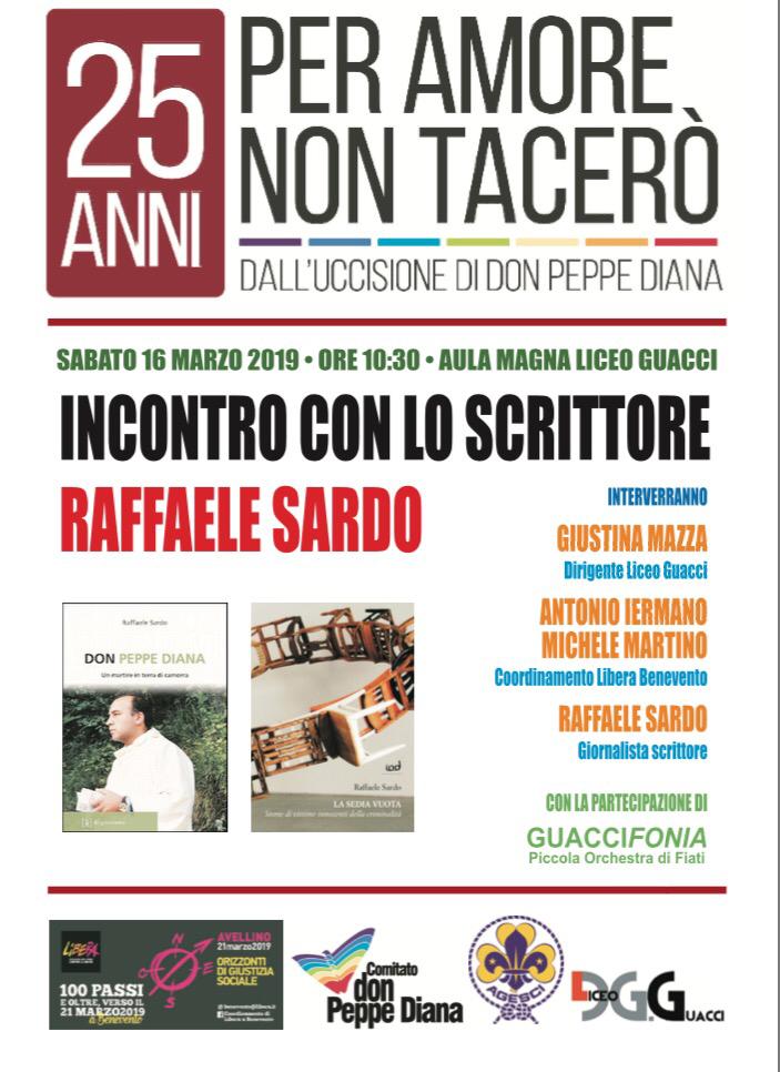 A venticinque anni dall’uccisione di Don Peppe Diana, il Liceo Guacci di Benevento organizza per sabato prossimo, 16 marzo, alle ore 10.30, un incontro con Raffaele Sardo, giornalista che ha collaborato con diversi quotidiani nazionali come “l’Unità”, “Il Manifesto”, “Ilfattoquotidiano.it” e con il programma Anno Zero. Attualmente firma su “La Repubblica”.