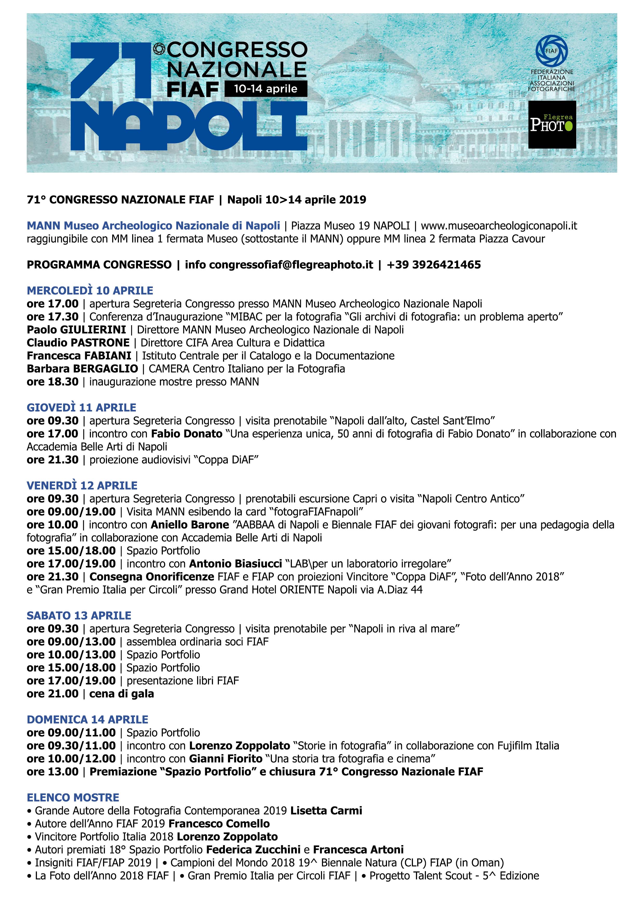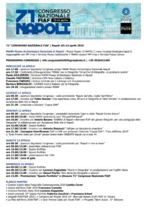 Tra le mostre fotografiche si segnalano quelle di grandi autori nazionali come Lisetta Carmi (grande autore della fotografia contemporanea 2019); Francesco Comello (autore dell’anno Fiaf); Lorenzo Zoppolato (vincitore Portfolio Italia 2018); Federica Zucchini e Francesca Artoni (Spazio Portfolio) e Oreste Pipolo (Napoli Velata), mentre gli incontri d’autore saranno con noti fotografi campani come Fabio Donato (“50 anni di fotografia”); Aniello Barone (“Per una pedagogia della fotografia”); Antonio Biasucci (“Per un laboratorio irregolare”); Gianni Fiorito (“Una storia tra fotografia e cinema”). Le premiazioni chiuderanno il congresso domenica 13 aprile.