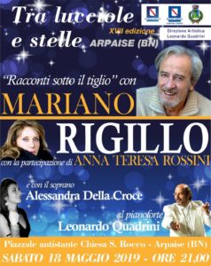Sarà un viaggio attraverso i sentimenti e i ricordi, la natura e la quotidianità il sesto appuntamento della XVII edizione “Tra lucciole e stelle…” di Arpaise. Protagonista della serata di teatro, musica e parole, l’attore e regista Mariano Rigillo, amatissimo dal pubblico sannita, con i suoi “Racconti sotto il tiglio”. La serata classica di prosa è fissata per sabato 18 maggio, alle ore 21:00, nel piazzale antistante la Chiesa San Rocco di Arpaise: scenario ideale per immaginare e rimembrare gli incontri quotidiani che avvenivano in altre epoche e periodi, in questa come in altre comunità sannite che avevano eletto il tiglio o il platano ad emblema centrale della piazza e della collettività.