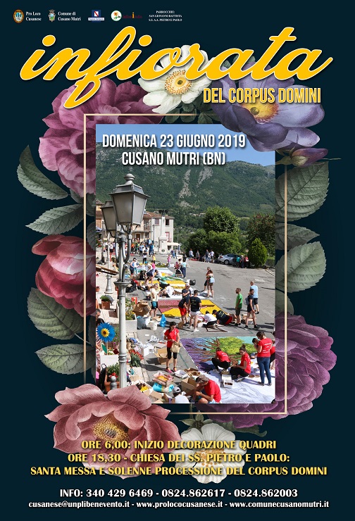 La ProLoco Cusanese e il Comune di Cusano Mutri presentano la XXIV edizione dell’Infiorata del Corpus Domini di Cusano Mutri che si svolgerà il 23 Giugno.