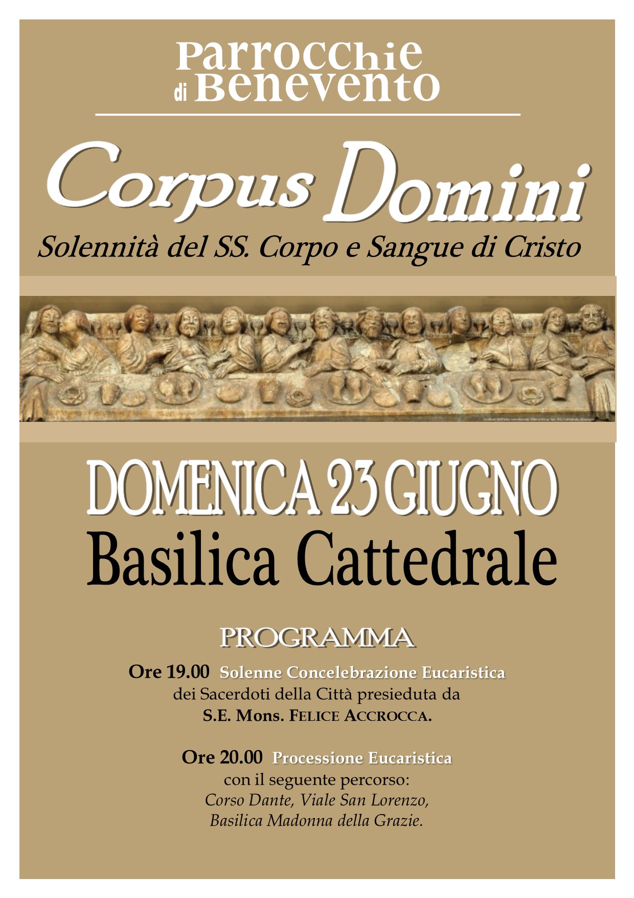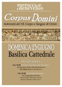 Domenica 23 giugno, in occasione della solennità del Corpus Domini, alle ore 19, l’arcivescovo metropolita di Benevento, S.E. Mons. Felice Accrocca, presiederà nella Basilica Cattedrale la solenne celebrazione eucaristica con i parroci della città di Benevento. Subito dopo seguirà la tradizionale processione, che partendo dalla Cattedrale arriverà fino alla Basilica della Madonna delle Grazie, attraversando corso Dante e viale San Lorenzo, e si concluderà con la benedizione eucaristica.