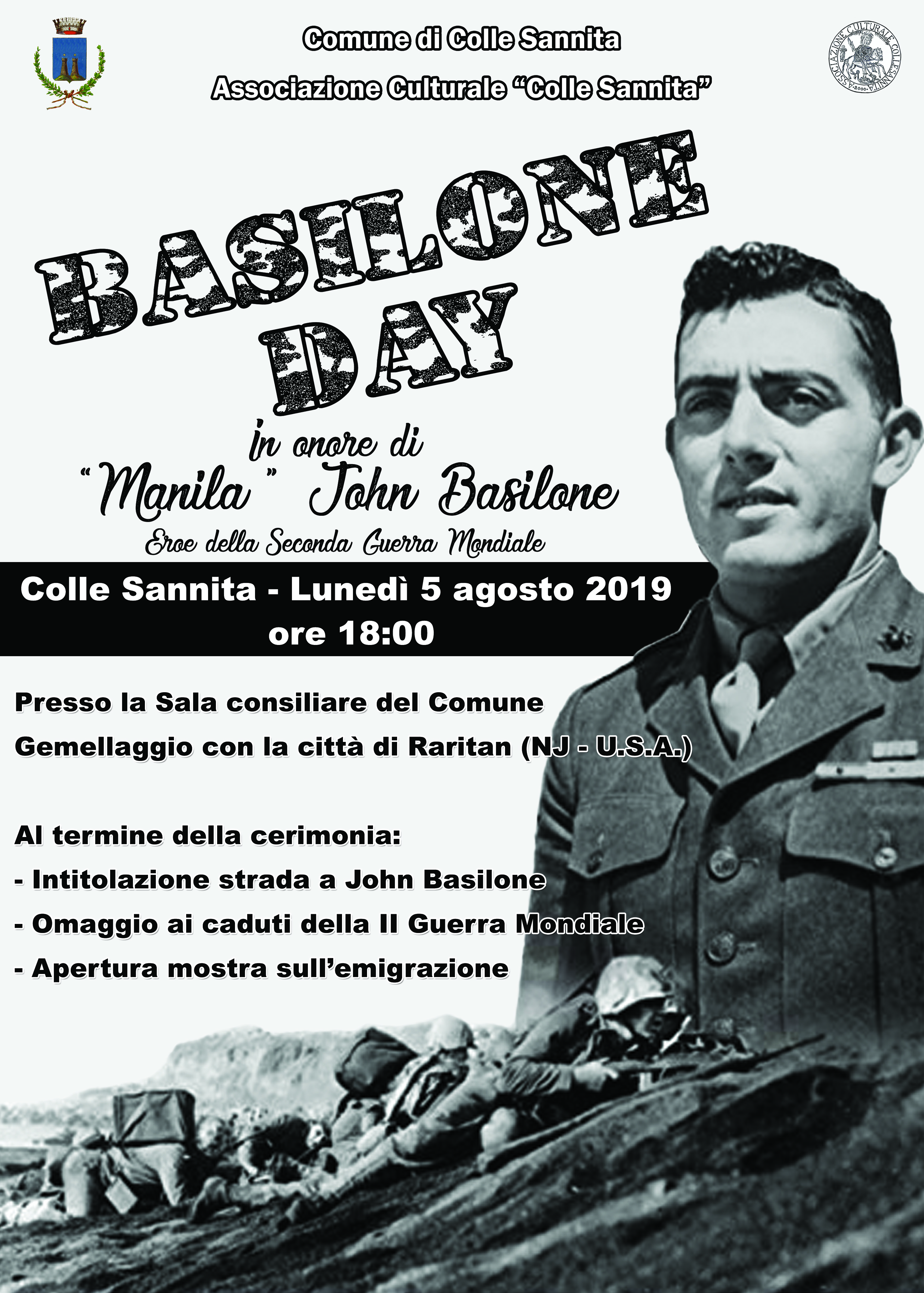 Il prossimo 5 agosto a Colle Sannita (Bn) si terrà la cerimonia “Basilone Day” in onore di Manila John Basilone, eroe della seconda Guerra Mondiale. L’evento culturale e storico prevede il gemellaggio con il comune sannita e la città di Raritan (NJ-Usa). La manifestazione, curata dall’associazione culturale “Colle sannita” è in programma dalle ore 18.00 e vede anche altri momenti importanti come: l’intitolazione della strada a Jhon Basilone, l’omaggio ai caduti della guerra mondiale e l’apertura della mostra sull’emigrazione.