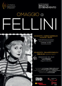 il 19 agosto alle ore 21.00, lungo il Corso Garibaldi, si parte con ‘La strada…la notte’,una performance di improvvisazione di danza a cielo aperto su musiche di Nino Rota, accompagnata dai musicisti dell’Orchestra Filarmonica di Benevento