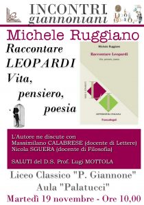 Martedì 19 novembre alle ore 10,00, presso l’Aula “Palatucci” del Liceo Giannone, sarà presentato il volume “Raccontare Leopardi. Vita, pensiero, poesia” (Franco Angeli, 2018) di Michele Ruggiano.