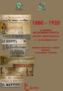Il Presidente della Provincia di Benevento, Antonio Di Maria, con l’Amministratore Unico di Sannio Europa, Giuseppe Sauchella, comunica che lunedì 9 dicembre 2019, alle ore 11.00 sarà inaugurata presso la Biblioteca Provinciale “Antonio Mellusi” al Corso Garibaldi, Palazzo Terragnoli, di Benevento la mostra emerografica “1880 – 1920. Il Sannio nei giornali d’epoca”.