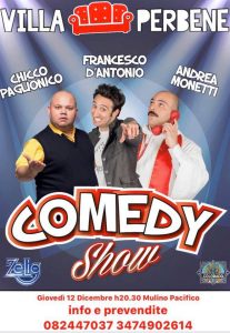 Giovedì 12 dicembre, alle ore 20.30, presso il Nuovo Teatro Mulino Pacifico, un appuntamento da non perdere con il Teatro Comico. In scena “Villa Perbene”, collettivo comico salernitano nato nel 2012 e composto da Chicco Paglionico, Francesco D’Antonio e Andrea Monetti, che conquisterà senza dubbio il folto pubblico della Solot, con lo spettacolo “Villa Perbene Comedy Show”.