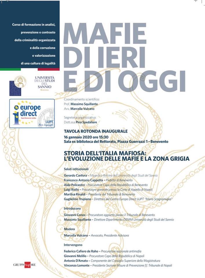 Giovedì 16 gennaio 2020 alle ore 15.30 presso Sala ex biblioteca del Rettorato, in Piazza Guerrazzi a Benevento, si terrà la presentazione del corso di formazione in analisi, prevenzione e contrasto della criminalità organizzata e della corruzione e valorizzazione di una cultura di legalità “Mafie di ieri e di oggi”.