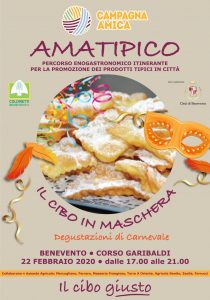 Il Carnevale 2020 all’insegna del gusto autentico dei prodotti agroalimentari sanniti. È il tema del secondo appuntamento di “Amatipico”, l’evento itinerante di street food contadino, organizzato da Coldiretti Benevento con le aziende agricole di Campagna Amica e il patrocinio del Comune di Benevento, in programma domani sabato 22 febbraio dalle ore 17 alle 22 su corso Garibaldi, all’altezza della Basilica di San Bartolomeo. Il percorso enogastronomico e culturale – previsto in più tappe – punta a valorizzare nei luoghi di socializzazione i prodotti tipici e tradizionali, realizzati e proposti direttamente dagli agricoltori, con l’obiettivo di far conoscere ai cittadini la ricchezza del patrimonio rurale.
