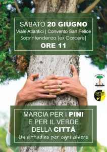 Il prossimo sabato 20 giugno 2020 alle ore 11.00 si svolgerà una manifestazione pacifica che partirà dalla Sovrintendenza (ex convento San Felice) in Viale degli Atlantici, a difesa e tutela dei pini e del verde in città.