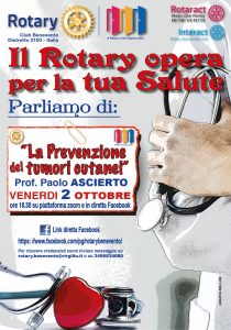 In ossequio alle norme di sicurezza dettate dalla presenza e diffusione del Covid-19, e quindi dalla responsabilità nei confronti di tutti, gli incontri de “Il Rotary opera per la tua salute”, saranno proposti per via telematica. Sarà possibile infatti, seguire e/o interloquire con i medici specialisti attraverso piattaforme zoom previa prenotazione e/o diretta su facebook.