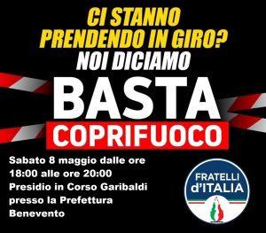 “Sarà una manifestazione nel rispetto delle regole vigenti che si svolgerà dalle 18:00 alle 20:00 con un flash mob presso la Prefettura di Benevento, per ribadire il nostro ‘no’ al coprifuoco che è una misura inutile, anche a detta degli esperti, che poteva essere eliminata con l’ultimo ordine del giorno portato in parlamento da Fratelli d’Italia. Non ci tiriamo indietro e anche a Benevento manifestiamo la nostra contrarietà”.