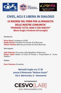 Martedì 6 luglio alle ore 17.30 CIVES – Laboratorio di formazione al bene comune, le ACLI provinciali di Benevento aps e Libera Benevento organizzeranno all’aperto presso il ristorante “Settimo Gusto” (in via Marmorale, 6 – Benevento) un incontro sul tema: “Le risorse del PNRR per la rinascita delle nostre comunità”. Sottotitolo dell’iniziativa è una frase del Presidente del Consiglio Mario Draghi, il quale recentemente sull’argomento si è così espresso: “Spendere tutto, bene e con onestà”.