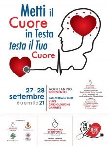 L’obiettivo principale della due giorni dell’iniziativa “METTI IL CUORE IN TESTA: TESTA IL TUO CUORE” è promuovere la buona salute cardiovascolare per tutta la Comunità del Sannio e, in particolare, per i pazienti che hanno già avuto un infarto, mantenendo i periodici controlli ambulatoriali raccomandati.