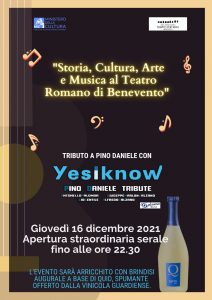 Un’occasione per una visita speciale che offre ai visitatori una prospettiva interpretativa del tempo e dello spazio attraverso la storia e la musica nel suggestivo scenario del Teatro romano di Benevento. Come tradizione, oltre ai saluti del direttore del Teatro arch. Giacomo Franzese e alle visite guidate a cura di Ferdinando Creta, la Salzano Band proporrà ai visitatori negli ambulacri uno spettacolo musicale che farà rivivere il Teatro Romano nella sua straordinaria monumentalità: un repertorio caro agli appassionati della buona musica con arrangiamenti in stile classico di celebri brani. L’evento sarà arricchito con un brindisi di augurale a base di Quid, spumante offerto dalla vinicola Guardiense.