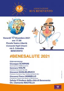 L’Associazione IO X Benevento, comunica di aver organizzato per venerdì 17 dicembre 2021, alle ore 17.15, presso il Piccolo Teatro Libertà (presso il Comando dei Vigili Urbani) in via S. Colomba, un evento per manifestare la propria riconoscenza a tutti gli operatori sanitari, dirigenti e amministratori, che sono stati e sono ancora impegnati a fronteggiare la pandemia Covid.