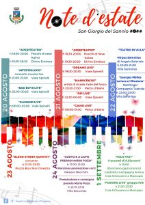 L’Amministrazione Comunale mira a fare di San Giorgio del Sannio la Città delle “Note d’estate”, mettendo su un programma ricco e creativo e compiendo non facili sforzi che hanno un solo obiettivo: restituire fiducia alle nostre attività commerciali e ridare speranza ai cittadini della nostra Città e del Sannio.