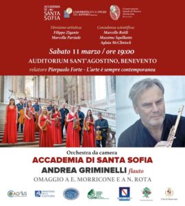 Sabato 11 marzo 2023, alle ore 19:00, all’Auditorium Sant’Agostino di Benevento, il virtuoso Andrea Griminelli, flautista di fama mondiale, con la sua interpretazione delle più famose e memorabili colonne sonore della storia del cinema, arriva a Benevento ospite, veramente speciale, dell’Orchestra da Camera Accademia di Santa Sofia.