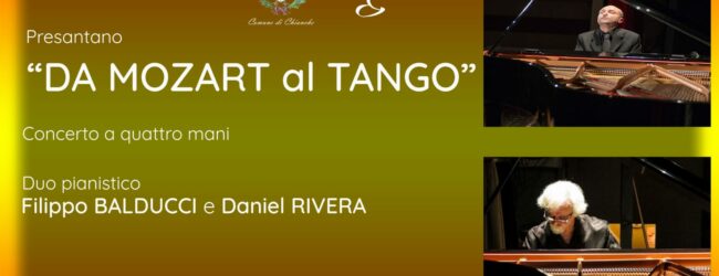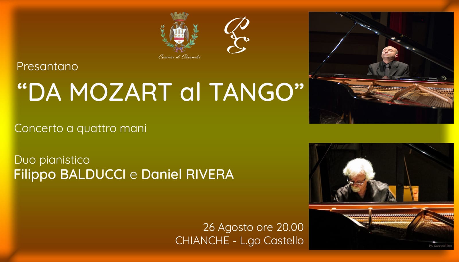 “Da Mozart al Tango”: una sinfonia che non ti aspetti. Sabato 26 agosto, con inizio alle ore 20:00 nell’emozionante cornice del largo del Castello del Duca San Donato di Chianche, concerto a quattro mani ad opera dei maestri Filippo Balducci e Daniel Rivera.