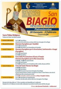 Presso la Parrocchia Maria Santissima Annunziata in Pietrastornina (AV), guidata dal Parroco Don Giovanni Panichella sono in programma i Solenni Festeggiamenti in onore di San Biagio Vescovo e Martire.