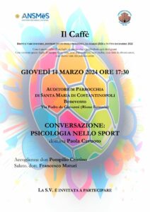 Benevento – “Conversazione: psicologia nello sport”, è il titolo dell’incontro organizzato dall’associazione ANSMeS in collaborazione e con il patrocinio della Parrocchia di Santa Maria di Costantinopoli di Benevento.