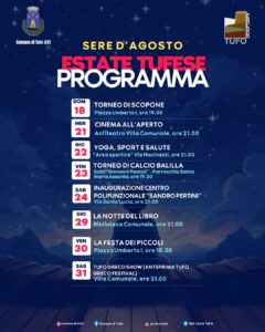 Giovedì 22, poi, appuntamento a Via Macinanti, a partire dalle ore 21:00 presso l’“Area sportiva attrezzata” per “Yoga, sport e salute”, con gli istruttori Maria Carpenito e Giuseppe Gaeta.Venerdì 23 tutti in parrocchia “Santa Maria Assunta”, presso la sala “Giovanni Paolo II”, per il torneo di Calcio Balilla, con partenza alle ore 19:30. Sabato 24 si svolgerà l’inaugurazione del Centro Polifunzionale “Sandro Pertini”, sito in via Santa Lucia, alle ore 21;00 a seguire, tanta allegria con lo spettacolo dei Musicisti Tufesi.