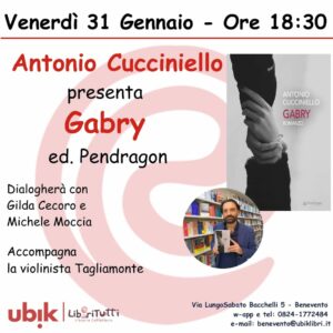 Il giorno venerdì 31 gennaio dalle ore 18:30, presso la libreria Ubik si terrà la presentazione del libro “Gabry” dell’autore Antonio Cucciniello. Con la partecipazione del prof Sergio Barile, professore ordinario di Economia e Gestione delle Imprese, facoltà di Economia, Università di Roma “La Sapienza”.