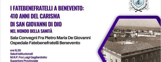 Mercoledì 26 febbraio alle ore 9.30, si terrà una giornata dedicata alla presenza dei Fatebenefratelli a Benevento: “410 anni del carisma di San Giovanni di Dio nel mondo della sanità” che andrà in scena della sala convegni Fra Pietro Maria dè Giovanni dell’Ospedale Sacro Cuore di Gesù Fatebenefratelli in viale Principe di Napoli a Benevento.