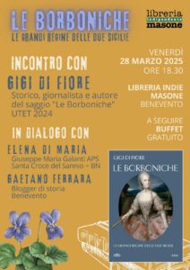 Venerdì 28 marzo 2025 alle ore 18:30, presso la libreria Indie Masone di Benevento, si terrà un incontro con Gigi Di Fiore, scrittore, storico e giornalista, per la presentazione del suo saggio storico “Le Borboniche” (2024), edito da De Agostini-Utet.