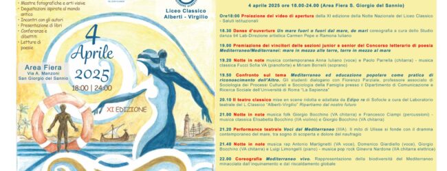 Per quanto riguarda il Liceo Classico Alberti-Virgilio, la serata del 4 aprile, che si terrà presso l’Area Fiera di via Manzoni a San Giorgio del Sannio, si aprirà con la proiezione del video della Notte Nazionale del Liceo Classico e con i saluti istituzionali della Dirigente Scolastica Silvia Vinciguerra, e proseguirà con una suggestiva danse d’ouverture dal titolo “Un mare fuori o fuori dal mare”, a cura dello Studio danza 94 Lab.