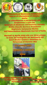 Il Presidente Giovanni Russo dell’Associazione Nazionale Combattenti Guerra di Liberazione di Arpaise, in collaborazione con la Parrocchia Beata Vergine Maria, San Rocco e San Sebastiano di Arpaise e del Santuario dei Santi Medici Cosma e Damiano in Terranova di Arpaise, guidate dal Parroco Don Albert Mwise, ha il piacere di invitare la cittadinanza, all’evento in programma organizzato in occasione dell’avvicinarsi delle festività della Santa Pasqua, con la Conferenza a cura del Generale di Divisione dell’Esercito Italiano Attilio Claudio Borreca, Presidente Regionale Campania-Molise dell’Associazione Nazionale Carristi d’Italia, sul tema “La storicità della passione e morte di Cristo”,