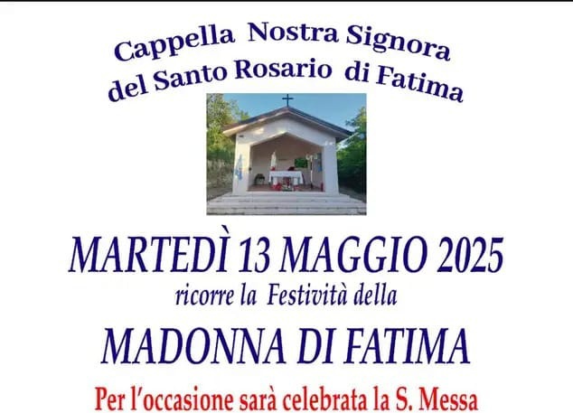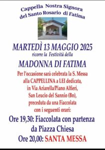 La Parrocchia San Leucio Vescovo di San Leucio del Sannio, guidata dal Parroco Don Michele Villani, per l’occasione celebrerà Martedì 13 Maggio 2025, la Solennità con la Santa Messa alla Cappella Nostra Signora del Santo Rosario di Fatima, in Via Ariarella/Piano Alfieri, in San Leucio del Sannio (Bn), preceduta da una Fiaccolata.