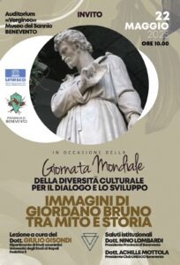 In occasione della «Giornata mondiale della diversità culturale per il dialogo e lo sviluppo», il Club per l’UNESCO di Benevento, operante sotto l’egida della Commissione Nazionale Unesco e in partnership con la Provincia di Benevento che patrocina l’evento, è lieto di annunciare un significativo incontro sul tema: «Immagini di Giordano Bruno tra mito e storia». L’evento si svolgerà giovedì 22 maggio, alle ore 10:00, presso l’auditorium «Vergineo» del Museo del Sannio a Benevento. La conferenza sarà tenuta dal Dott. Giulio Gisondi, studioso della figura di Giordano Bruno, ricercatore del Dipartimento di Studi umanistici dell’Università degli Studi di Napoli «Federico II». Sono previsti anche i saluti istituzionali del Presidente della Provincia di Benevento, Dott. Nino Lombardi, e del Presidente del Club per l’UNESCO di Benevento, Dott. Achille Mottola.