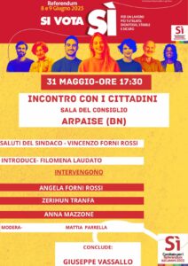 Sabato 31 maggio alle ore 17:30, si terrà presso la Sala Consiliare del Comune di Arpaise, un incontro pubblico con i cittadini, promosso dal Comitato Referendario del SÌ Cittadino, in vista dei referendum del prossimo 8 e 9 giugno sostenuti dalla CGIL.