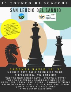 San Leucio del Sannio si prepara ad ospitare il 1° Torneo di Scacchi, un evento aperto a tutti gli appassionati e organizzato nell’ambito della “Salsiccia Experience” dalla Pro Loco “Casali dei Collinari”, con il supporto dell’Associazione “Scacchi Valle Caudina”. L’appuntamento è fissato per il 5 luglio 2025, dalle 16:00 alle 20:00, in Piazza Chiesa, Via Roma n.35. Il torneo si svolgerà con cadenza rapid, 10 minuti a partita più 3 secondi di incremento per mossa, secondo il sistema svizzero con spareggio Buchholz.