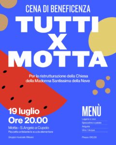 La Parrocchia San Matteo Apostolo della Comunità di Motta, frazione di Sant’Angelo a Cupolo, invita tutti i cittadini, amici e simpatizzanti a partecipare alla Cena di Beneficenza che si terrà sabato 19 luglio, a partire dalle ore 20:00, in Piazza della Repubblica (nell’area antistante la scuola).