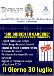 Si terrà alle ore 12.30, e non come inizialmente programmato alle ore 11.00, del 30 luglio 2025, mercoledì, all’esterno del Carcere di Capodimonte di Benevento, la Conferenza Stampa della, la Garante territoriale delle persone private della libertà della Provincia di Benevento Patrizia Sannino nell’ambito della giornata di mobilitazione nazionale indetta dalla Conferenza dei Garanti contro i suicidi in carcere. La manifestazione è indetta d’intesa con la Camera Penale di Benevento “Guido del Basso De Caro”. Obiettivo è sollecitare misure concrete a livello nazionale e locale per ottenere migliori condizioni di vita negli Istituti di detenzione.
