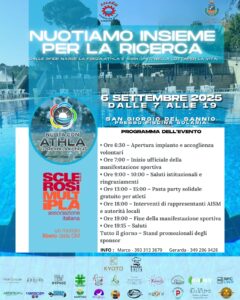 San Giorgio del Sannio (BN), 3ª edizione – Sabato 6 settembre 2025, dalle ore 7:00 alle 19:00, presso la piscina comunale Solaria di San Giorgio del Sannio (via C. Bocchini, 139), si terrà “Nuota con ATHLA – 12 ore per la Ricerca”, un evento di nuoto endurance aperto a tutti, ideato da ATHLA in collaborazione con la struttura Solaria, per sostenere la sezione di Benevento dell’AISM – Associazione Italiana Sclerosi Multipla.
