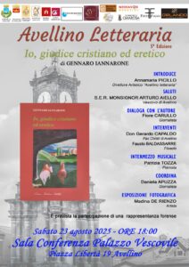 Il salotto culturale di Avellino Letteraria, giunto alla quinta edizione, cambia location. Sabato 23 agosto alle ore 18, presso la sala conferenze del Palazzo Vescovile di Avellino, sarà ospite Gennaro Iannarone con il libro “Io giudice cristiano ed eretico” (Guida editori).