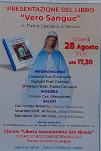 Giovedì 28 agosto 2025, alle ore 17.30 presso il circolo “Libera Associazione San Nicola” a Tuoro di Roccabascerana, sito in Piazza Giuseppe Covino, Padre Gervasio D’Alessio, Religioso camilliano, presenterà il suo nuovo lavoro editoriale dal titolo ”Vero sangue”.