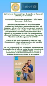 Domenica 28 Settembre in occasione delle celebrazioni delle Sante Messe alle ore 10.00 ad Arpaise e alle ore 11.00 a Terranova, sarà presente dinanzi le Chiese, con i propri soci e volontari, dove sarà possibile acquistare una piantina di ulivo, con una donazione minima di 15,00 euro, potrai supportare il progetto “Bambini nelle Emergenze” di UNICEF.