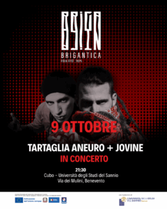 Con il patrocinio dell’Università degli Studi del Sannio, che accoglierà il pubblico nel proprio spazio “Cubo”, in via dei Mulini, il Festival Brigantica conclude la sua prima edizione con un grande evento live: giovedì 9 ottobre 2025, alle 21:30, il concerto di Tartaglia Aneuro e la sua band con ospite Jovine porterà a Benevento una serata di musica e partecipazione.