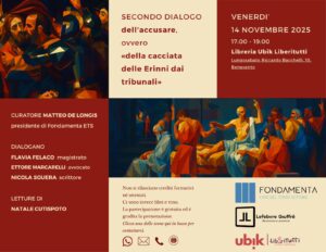 Prosegue a Benevento il ciclo “Dialoghi sulla Giustizia”, promosso da Fondamenta ETS, con il secondo incontro, dedicato a un tema di grande spessore etico e filosofico: “Dell’accusare, ovvero della cacciata delle Erinni dai tribunali”.