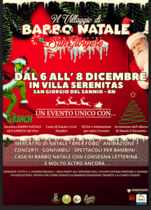 La magia del Natale arriva nel cuore del Sannio con la prima edizione del “Villaggio di Babbo Natale Sangiorgese”, in programma dal 6 all’8 dicembre 2025 presso Villa Serenitas. L’iniziativa è promossa da Siano Event, in collaborazione con la Pro Loco San Giorgio del Sannio e l’Associazione Migrantes, e punta a offrire al territorio un evento unico per famiglie, bambini e appassionati delle atmosfere natalizie.