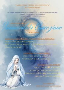 Lunedì 8 Dicembre Solennità dell’Immacolata Concezione, alle ore 11.00 Santa Messa, atto di Consacrazione e omaggio floreale dei bambini alla Vergine Maria,