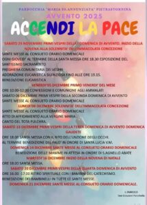 In attesa della venuta del Signore Gesù, il Parroco Don Giovanni ha diffuso ai fedeli il programma delle Celebrazioni dell’Avvento 2025 dal titolo “Accendi la Pace”, pregando per la pace nel mondo e nei territori colpiti dalla crudeltà della guerra.