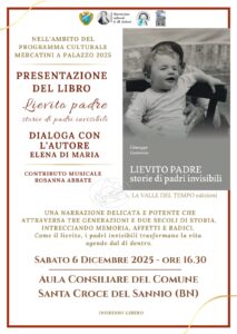 Sabato 6 dicembre alle 16:30 nell’aula consiliare del Comune, sarà presentato il libro “Lievito padre. Storie di padri invisibili” di Giuseppe Genovese. L’autore dialogherà con Elena Di Maria, col contributo musicale di Rosanna Abbate.