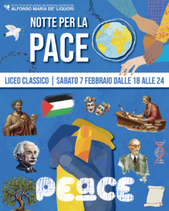 Quest’anno il Liceo Classico di Sant’Agata de’ Goti ha scelto di trasformare la tradizionale “Notte del Liceo” in un progetto speciale, dando vita a “La Notte per la Pace”, un evento nato dall’esigenza, anzi dall’urgenza, di non restare inerti di fronte a quanto sta accadendo nel mondo e di dare voce a un bisogno profondo e condiviso di pace, giustizia e punti di riferimento civili, nazionali e internazionali.
