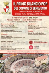 Domani, giovedì 19 febbraio, con inizio alle ore 10:30, presso la sala dell’Antico Teatro di Palazzo Paolo V, si terrà il convegno sul tema “Il primo Bilancio Pop del Comune di Benevento – Rendicontazione orientata al dialogo e alla partecipazione pubblica”.